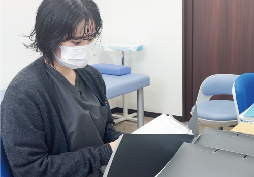受付の締め作業や会計の照合を済ませ、カルテや書類を整理します。
